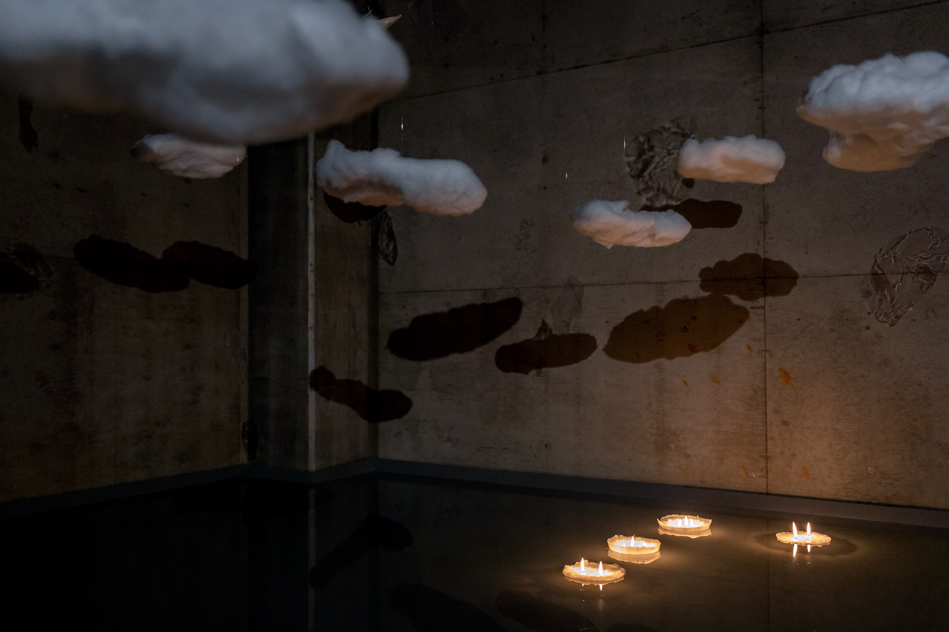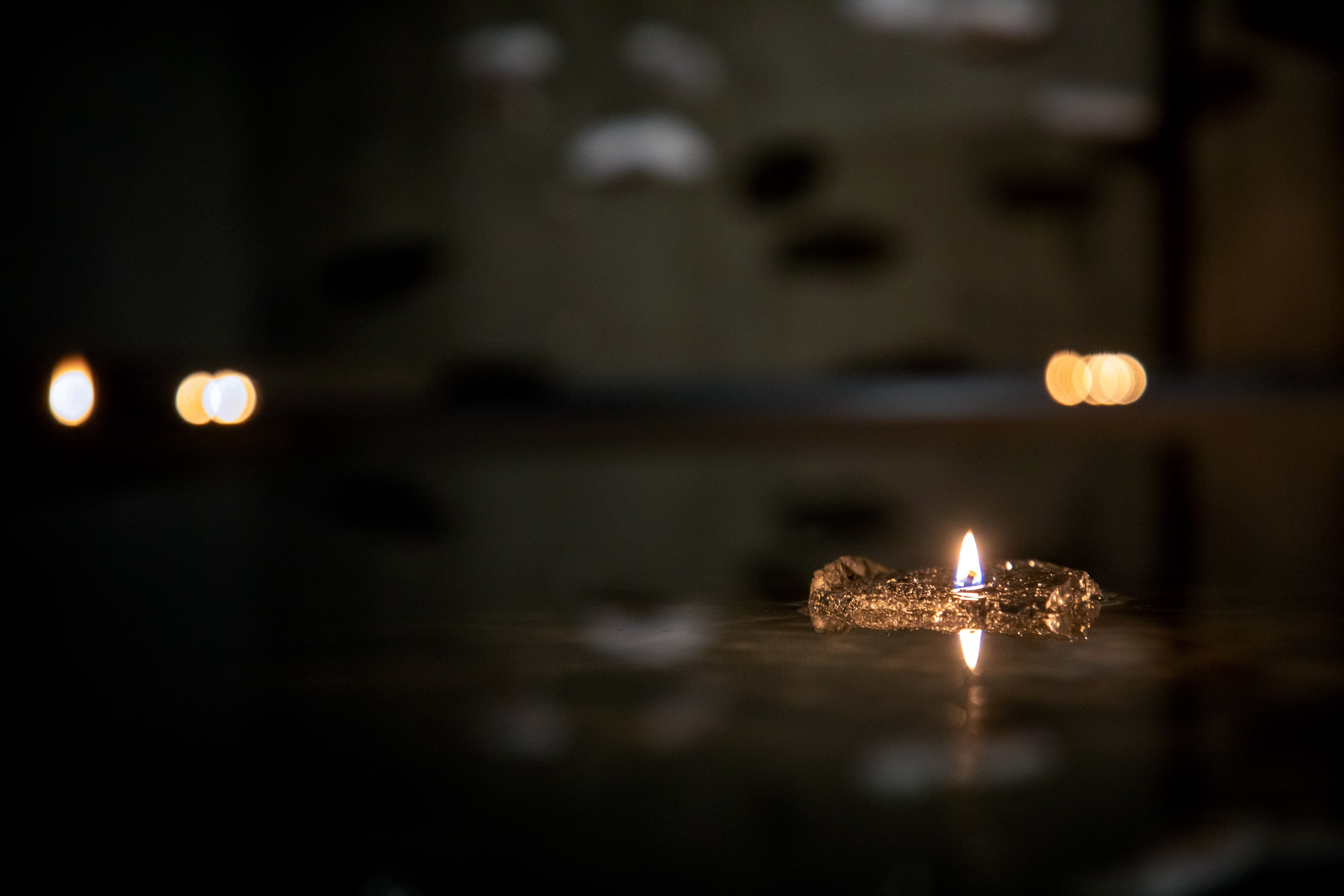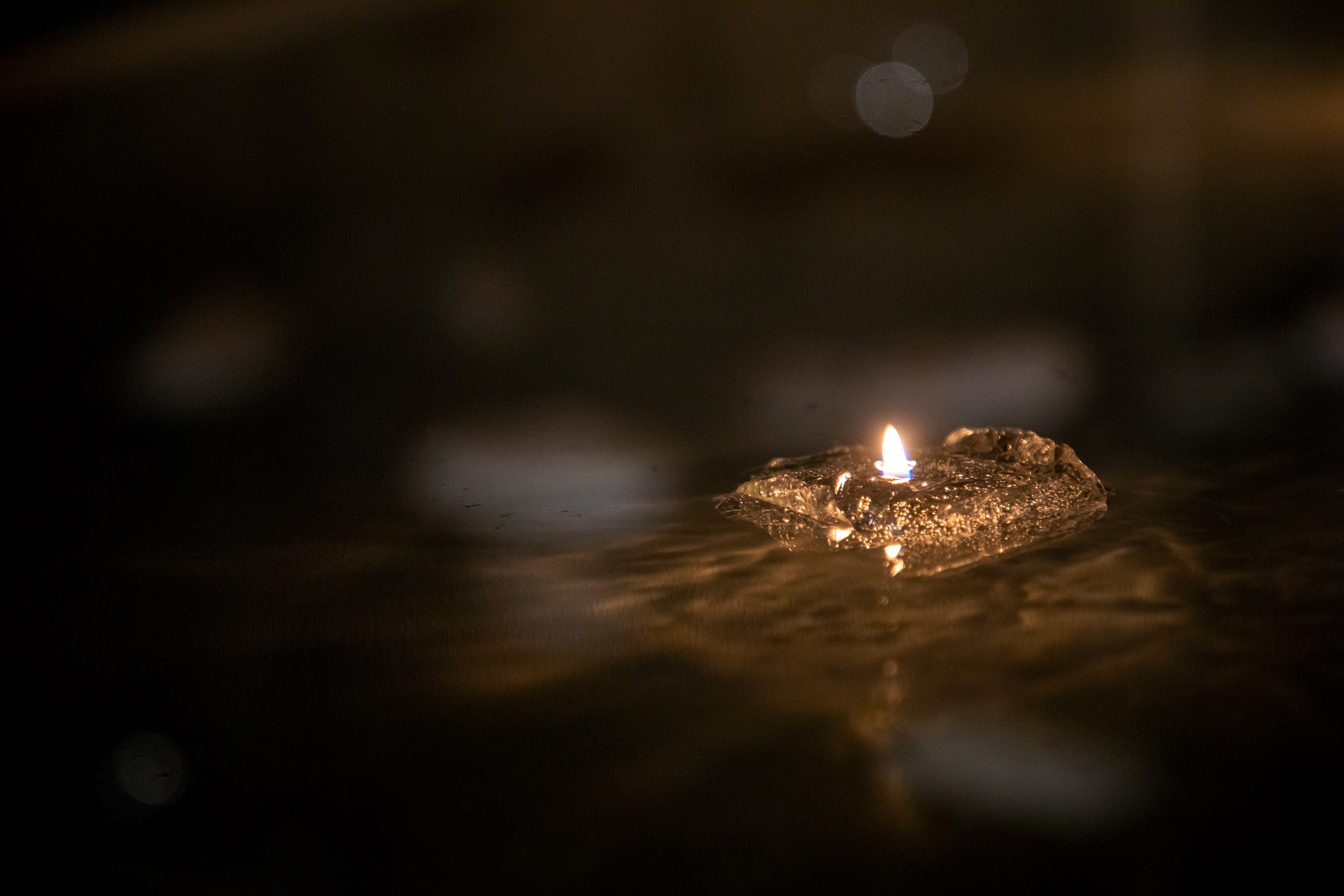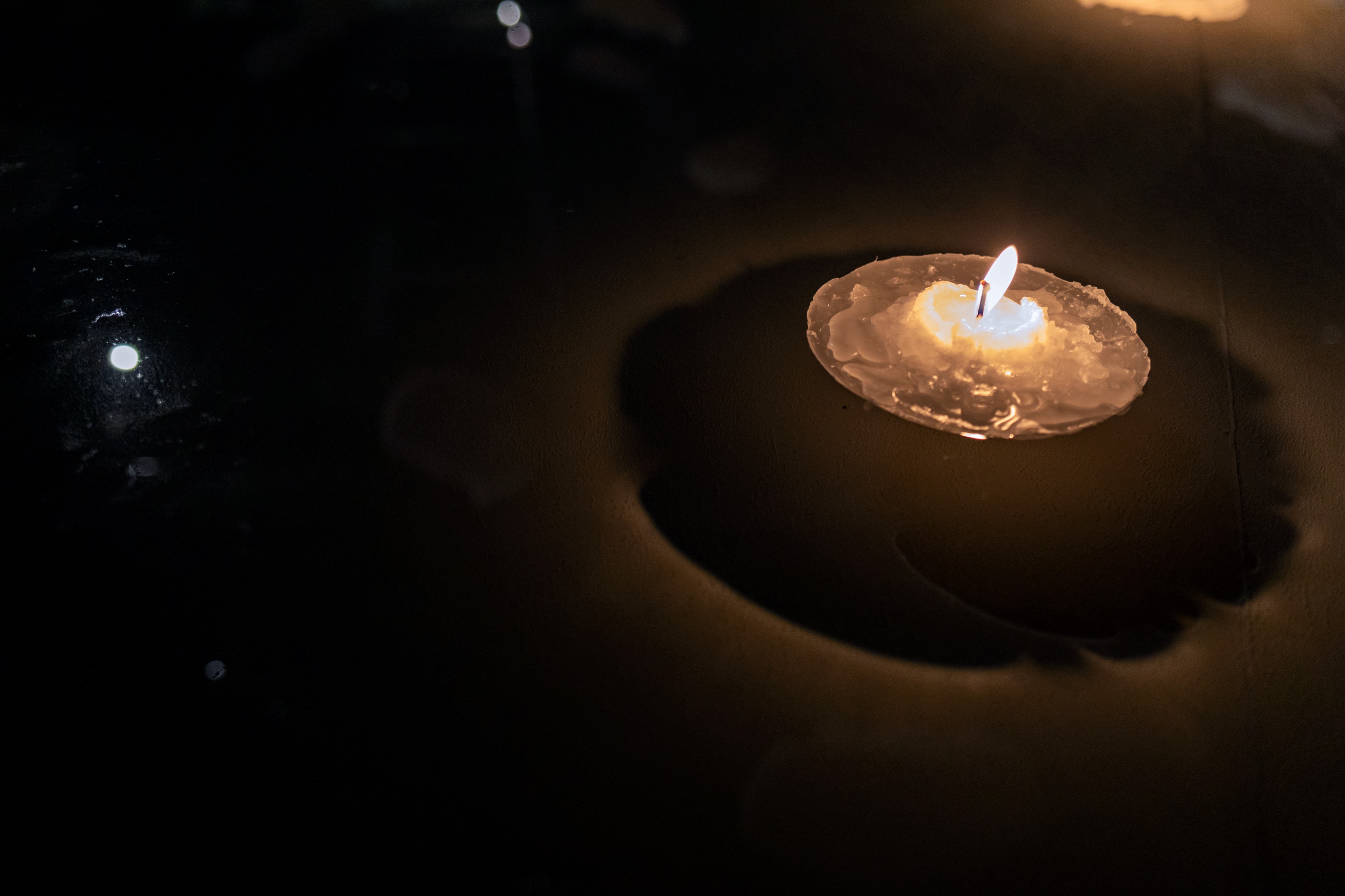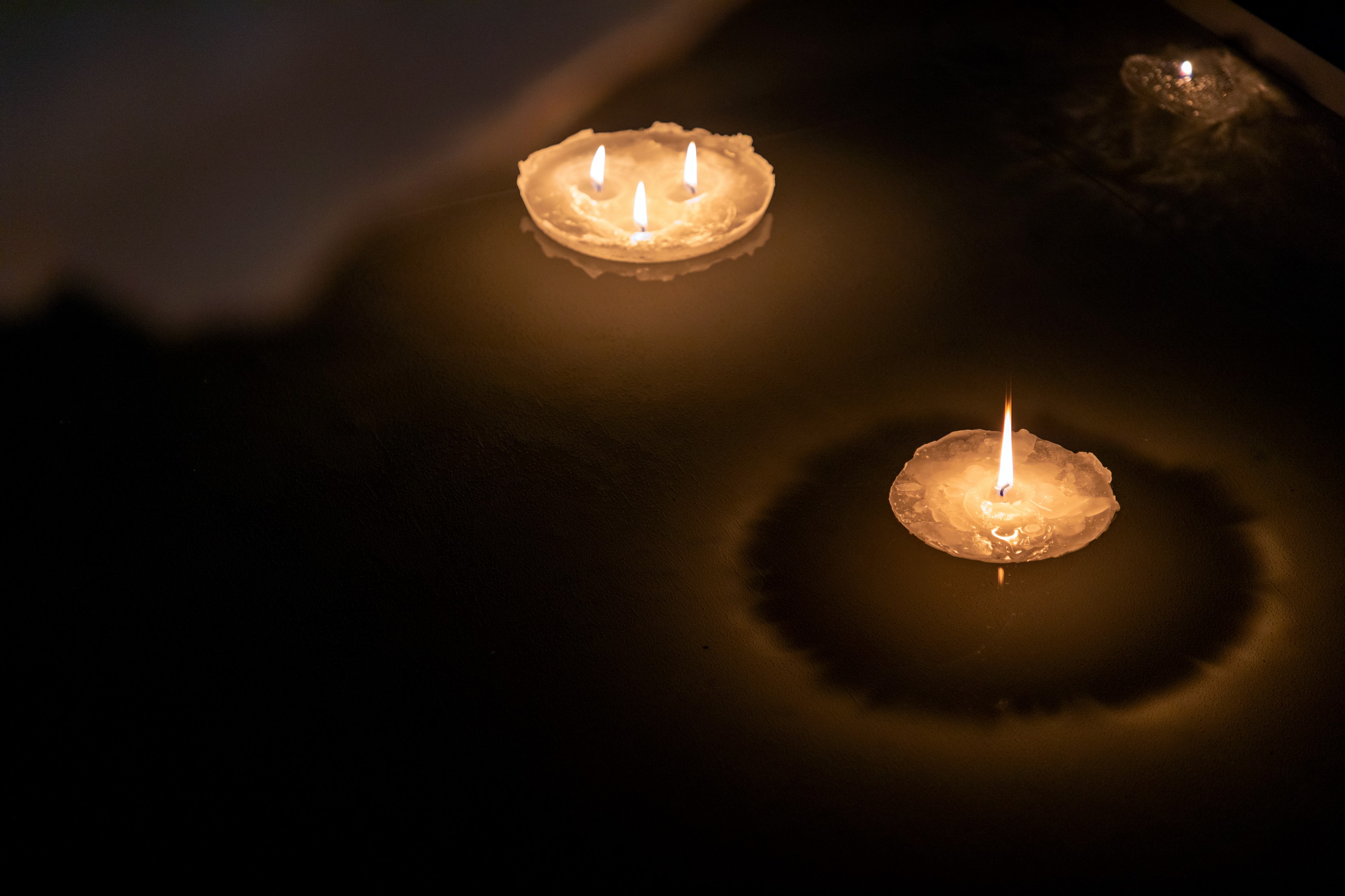 蓮の葉の様に水盤に浮くキャンドルの炎から